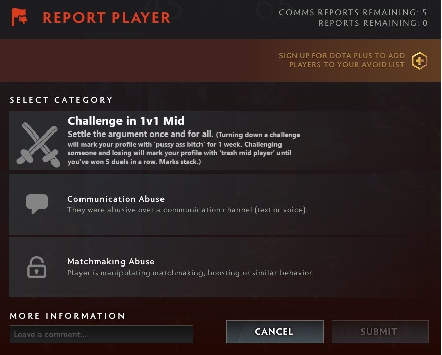 Theo đó, Redditor này đã chia sẻ ý kiến về việc bổ sung thêm tính năng gạ kèo solo sau mỗi trận đấu Dota 2 để giải quyết nhu cầu cá nhân của mỗi người. Nếu người bị gạ kèo không nhận lời, người đó sẽ bị gán mác “pussy ass bitch” trong suốt 1 tuần. Còn nếu thất bại trong loạt solo, anh chàng đó sẽ phải nhận hậu quả khủng khiếp, đó là danh hiệu “Trash Mid Player” to khổng lồ trong profile và chỉ có thể bị xóa đi khi đạt đủ 5 trận thắng solo liên tiếp. Công bằng mà nói đây quả thật là một ý tưởng tuyệt vời bởi nó sẽ giúp chúng ta có thể “khóa mõm” những ông thần thích gáy bẩn mặc dù kỹ năng chả ra đâu vào với đâu. Từ đó, giúp cho những tranh cãi cá nhân có thể được giải quyết nhanh chóng thay vì cứ phải ôm cục tức vào người mà không cách nào xả ra được. Ý tưởng này đã nhận được rất nhiều sự ủng hộ của cộng đồng Dota 2 thế giới. Thậm chí, họ còn vạch ra cả những idea mới lạ để hoàn thiện tính năng này với những ý tưởng cho phép đồng đội của 2 người có thể theo dõi, hoặc thậm chí là đặt cược cho kèo solo này.