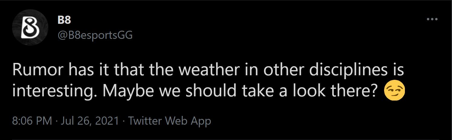 Mới đây, vào ngày 26 tháng 7, trang Twitter chính thức của B8 đã có một dòng Tweet tương đối “có mùi” khi đề cập đến một bộ môn nào đó khác có vẻ khá thú vị, và họ muốn qua đó để kiểm chứng xem có đúng là nó hay như lời đồn hay không.