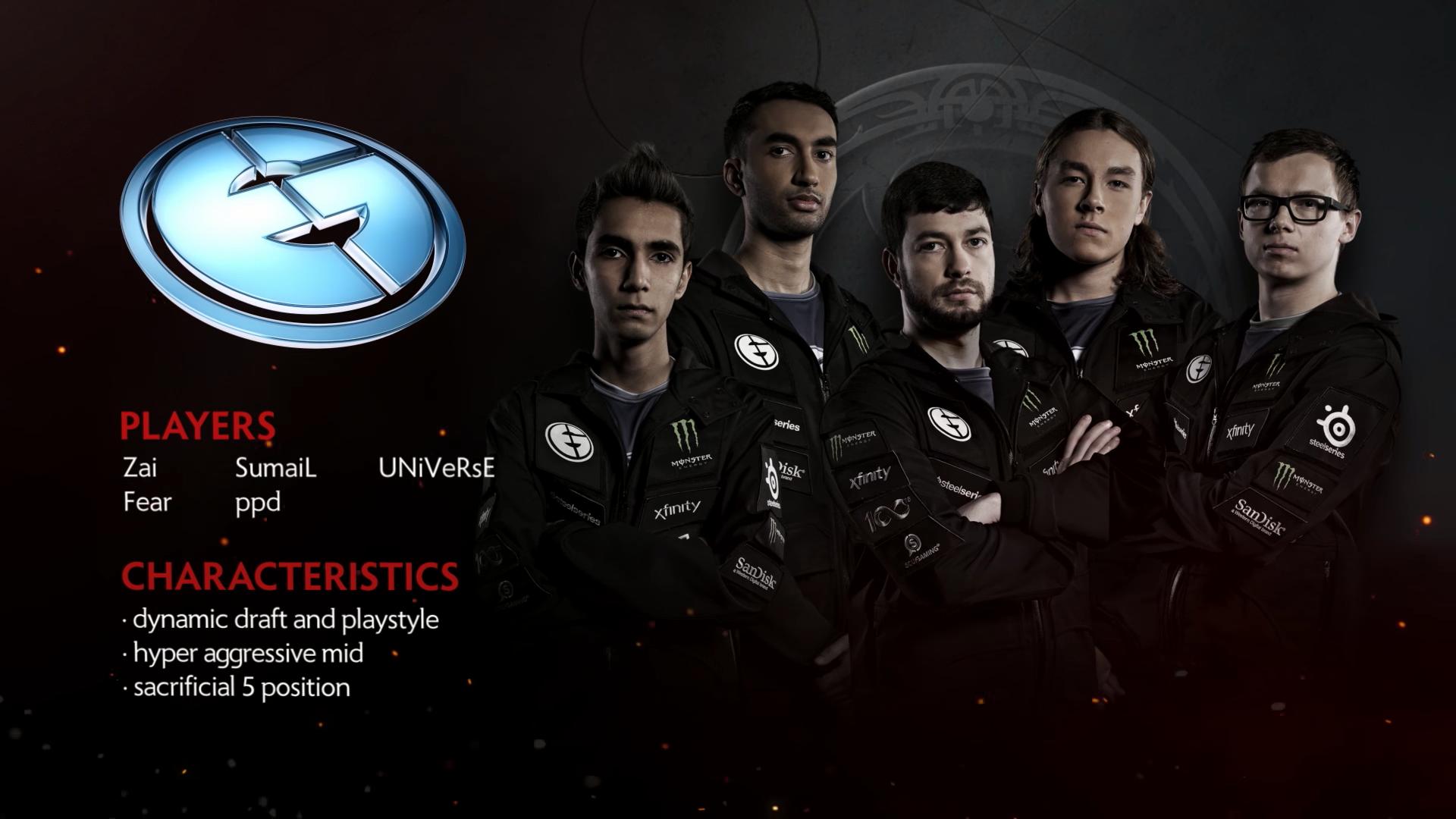 Evil Geniuses – Niềm tự hào của Dota 2 Bắc Mỹ, trở lại với đấu trường Dota 2 lớn nhất hành tinh sau 1 năm với tư cách đương kim vô địch của giải đấu. Vẫn với những con người đấy, ngoại trừ sự xuất hiện của tân binh Zai để thay thế cho khoảng trống của Aui_2000 để lại, đội hình hùng hậu của EG được kỳ vọng sẽ trở thành đội tuyển đầu tiên trong lịch sử bảo vệ thành công chức vô địch The International. Dưới sự cổ vũ của hàng loạt khán giả tại nhà thi đấu KeyArena, SumaiL cùng các đồng đội đã có màn thể hiện vô cùng ấn tượng khi cán đích ở vị trí thứ 2 tại vòng bảng, rồi sau đó đánh bại Newbee trong ngày thi đấu đầu tiên tại Main Event.