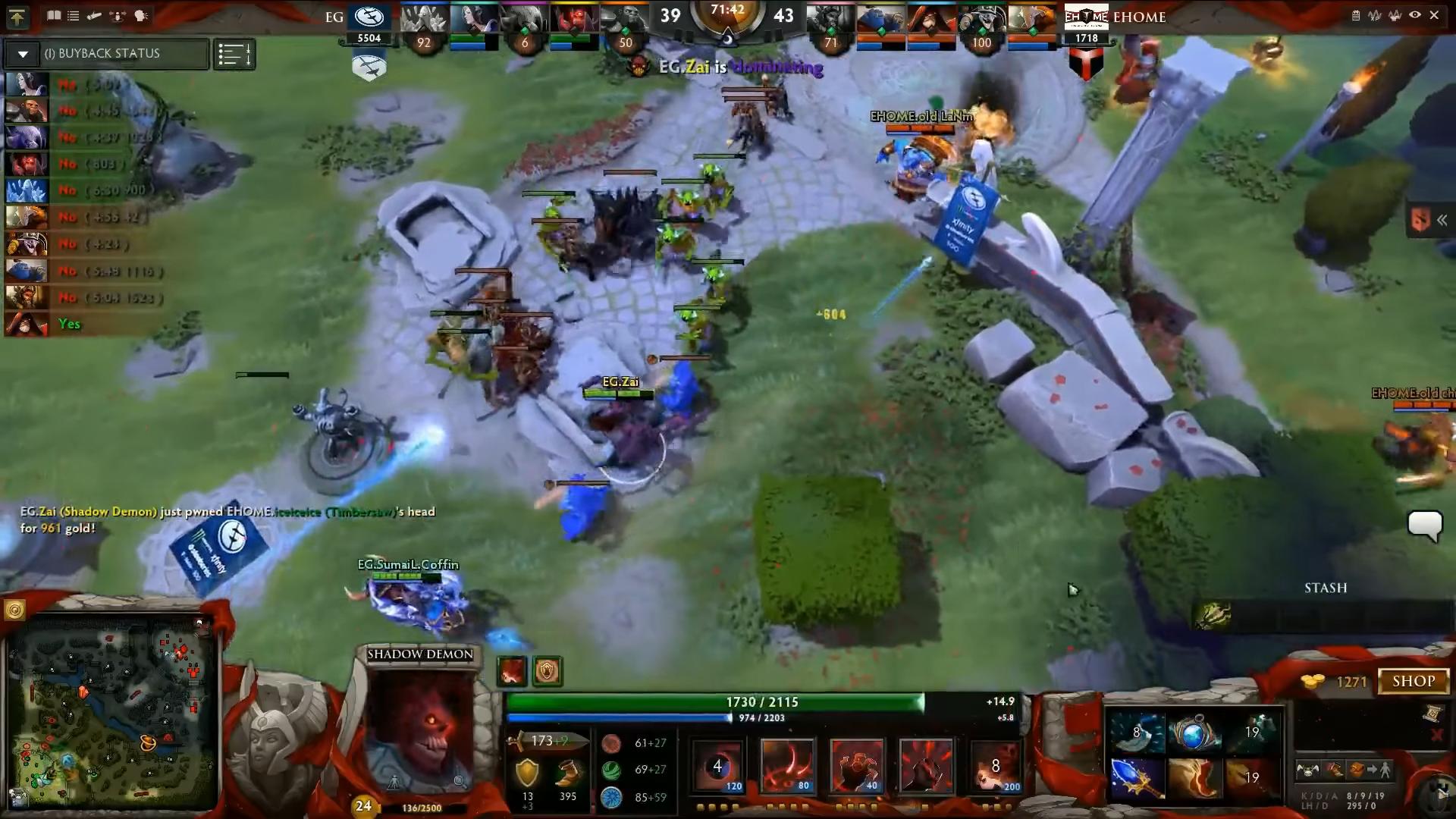 Đối thủ tiếp theo mà những nhà vô địch phải đối mặt, đó là một EHOME hùng mạnh được dẫn dắt bởi bộ đôi quái kiệt của huyền thoại DK – LamN và Iceiceice. Dù cho phải thi đấu dưới sức ép của hàng vạn fan hâm mộ Bắc Mỹ, đại diện đến từ Trung Quốc vẫn tỏ ra vô cùng tự tin với những lượt pick dị nhưng đầy hiệu quả. Timbersaw, dù không phải là lượt pick quá được ưa chuộng ở meta lúc đó nhưng lại thể hiện một sức mạnh vô cùng khủng khiếp khi được sử dụng bởi lão tướng người Singapore. Iceiceice đã hành hạ toàn bộ đội hình bên phía Evil Geninuses lên bờ xuống ruộng, giúp cho EHOME vượt trội lên hẳn so với đối thủ về tất cả mọi mặt chỉ sau 10 phút thi đấu.