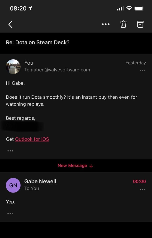 Theo những gì mà Valve đã quảng cáo, Steam Deck sở hữu cấu hình cực khủng và hoàn toàn có thể thoải mái chiến mọi tựa game đang có trong kho tàng đồ sộ của Steam. Đương nhiên, lời khẳng định của Steam khiến nhiều người tỏ ra hoài nghi bởi họ cũng cảm thấy khó tin khi chiếc máy Console cầm tay này có thể thay thế một chiếc PC đồ sộ. Game thủ Dota 2 đương nhiên cũng không phải ngoại lệ khi mà chủ đề này đã được bàn tán rất sôi nổi trong Reddit suốt một ngày vừa qua. Để chắc ăn, một game thủ có tên 1LastHit2Die4 thậm chí còn mail trực tiếp thẳng cho người đứng đầu của Valve là Gabe Newell, và anh chàng này quả thật là may mắn khi đã được Lord của làng game nhanh chóng hồi âm chỉ trong chưa đầy 24 tiếng đồng hồ.