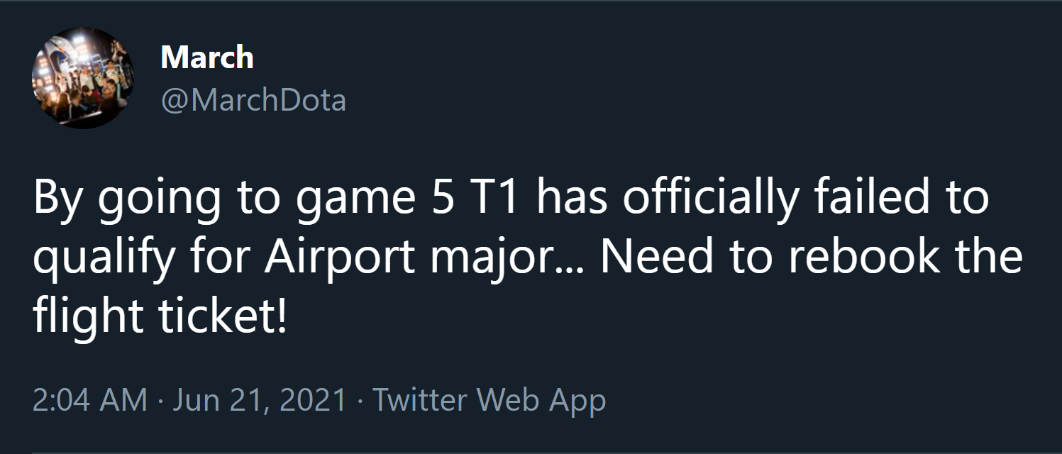 Nét mặt cau có, đầy lo lắng của March đã trở thành đề tài bàn tán của cộng đồng Dota 2 trong suốt nửa ngày vừa qua. Nhiều người cho rằng March từng là một đội trưởng cực kỳ nghiêm khắc khi còn thi đấu cùng với việc anh từng thực hiện nghĩa vụ quân sự trong quân đội Hàn Quốc, nên anh không muốn các đồng đội tỏ ra vui mừng quá đà ngay cả khi giành chiến thắng. Nhưng sự thật thì không phải là vậy. Đằng sau vẻ mặt cau có của HLV người Hàn Quốc là tấm vé máy bay rời Kiev của cả đội. Vậy là hóa ra không phải là do March khó tính hay nghiêm khắc mà chỉ đơn giản là anh đang cố gắng để thúc giục các đồng đội chuẩn bị hành lý để ra sân bay trước khi lỡ mất chuyến bay. Nhưng bất chấp những nỗ lực của HLV người Hàn Quốc, T1 vẫn đã lỡ hẹn với chiếc máy bay trở về Philippines và buộc phải chờ đợi chuyến bay khác.