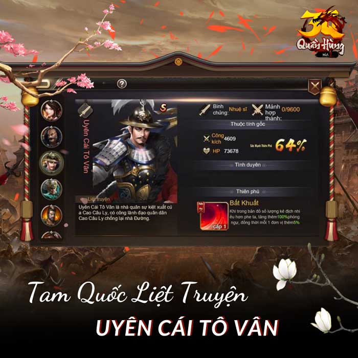 Ngoài ra mỗi vị tướng đều sở hữu bộ kỹ năng riêng biệt cũng như vai trò khác nhau trong trận hình tác chiến của game thủ. Giờ đây khi đã nắm trong tay quyền lực tối thượng cùng với nhân sĩ hàng đầu thì việc chinh phục giang sơn như thế nào là tùy thuộc vào anh em.