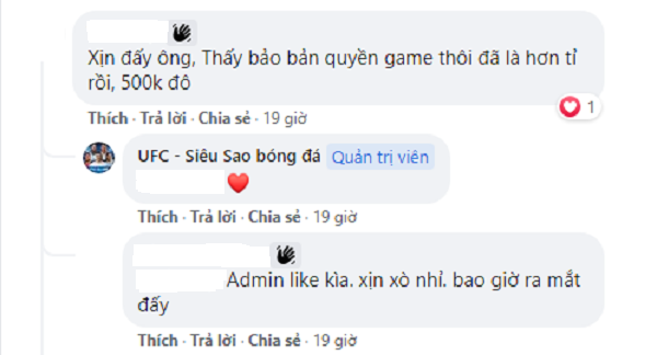 Xung quanh những thông tin đồn đoán về chất lượng cũng như nội dung game, các game thủ còn căn cứ vào tiền bản quyền game để nhận định về sự uy tín của trò chơi. Khi có thành viên bình luận rằng số tiền bản quyền mà VTC Game bỏ ra không dưới 500.000$, tương đương với hơn 1 tỷ VNĐ, admin của group đã không ngần ngại thả tim ngay dưới comment sặc mùi “đầu tư” này. Không trả lời trực tiếp song động thái này của VTC Game đang đính chính khéo léo việc UFC – Siêu Sao Bóng Đá là tựa game có bản quyền lên đến con số hàng tỷ đồng. Điều đó cũng đồng nghĩa với UFC – Siêu Sao Bóng Đá chắc chắn sẽ là sân chơi đỉnh cao giúp fan môn thể thao vua thỏa mãn niềm đam mê, giao lưu anh em bốn phương và được trải nghiệm rất nhiều điều hay ho.
