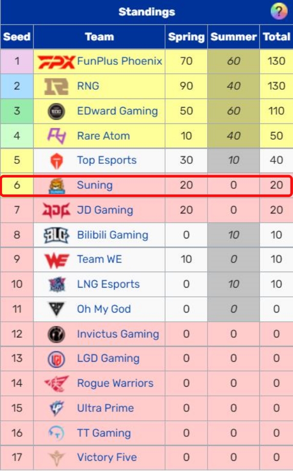 Không chỉ kết thúc LPL hè 2021 sau trận thua trước LNG, Suning cũng chính thức mất đi cơ hội tham dự CKTG 2021. Chỉ có được 20 điểm tích lũy ở giai đoạn mùa xuân, Suning đang đứng ở vị trí thứ 6, vị trí để được tham dự vòng loại khu vực. Tuy nhiên với việc 3 đội BLG, WE, OMG chung nhánh thì chắc chắn 1 trong 3 sẽ lọt đến round 3 playoffs và có thêm 40 điểm tích lũy.
