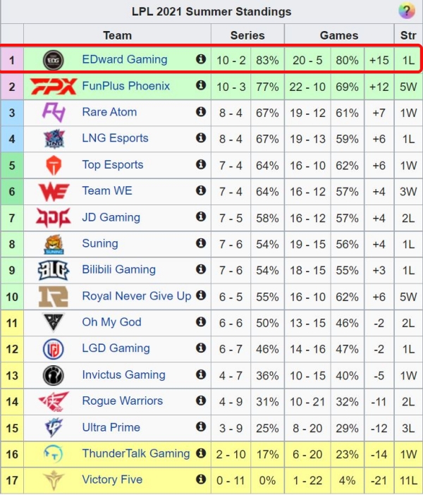 Tại LPL hè 2021, Edward Gaming đang thể hiện được sức mạnh của mình với đội hình gồm nhiều ngôi sao. Mặc dù vừa để thua 0 – 2 trước RNG mới đây nhưng EDG vẫn đang ngự trị ở ngôi đầu BXH với hiệu số 10 – 2. Với thành tích hiện tại, EDG đã chắc suất tấm vé vào playoffs và đây là lúc đội tuyển này cần những sự thử nghiệm để có thêm những mảng miếng chiến thuật trước khi bước vào vòng knock-out vô cùng khốc liệt phía trước.