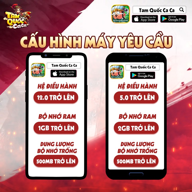 Cấu hình của Tam Quốc Ca Ca rất “dễ thở” cùng dung lượng bộ cài siêu nhẹ: chưa đến 300MB cho Android và chỉ gần 40MB cho hệ điều hành iOS, đảm bảo mọi game thủ, mọi dòng máy đều có thể chơi mượt Tam Quốc Ca Ca. Cụ thể, các thiết bị sử dụng hệ điều hành Android phải từ phiên bản 5.0 trở lên, ít nhất 2GB RAM và tối thiểu 500MB bộ nhớ trống. Về phía iOS, thiết bị cần sử dụng phiên bản iOS 12.0 trở lên, 1GB RAM cùng 500MB bộ nhớ trống.