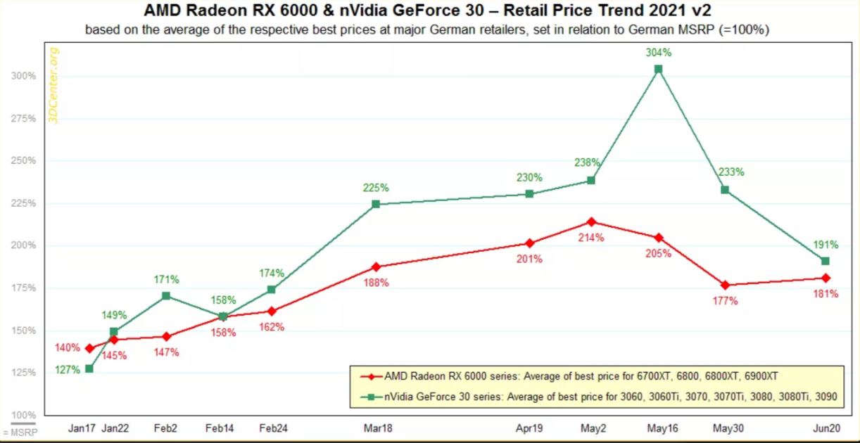 Card của đội Đỏ cũng gặp phải tình trạng tương tự nếu biến động giá ít khắc nghiệt hơn. Dòng Radeon RX 6000 cao hơn 114% so với MSRP vào đầu tháng 5 và đã giảm xuống 81% vào tháng 6 mặc dù đã có một mức tăng nhỏ trong 3 tuần qua.