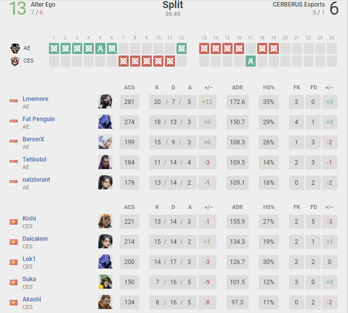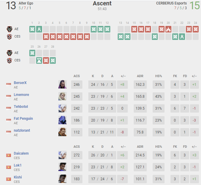 Đến với bản đồ quen thuộc Ascent, CES dường như đã tìm lại được chính mình khi có được 7 round thắng liên tiếp để kết thúc nửa trận đầu với tỉ số 7-5. Với lợi thế ở bên Phòng Thủ thì CES đã có được match-point trước Alter Ego khi dẫn trước với tỉ số 12-10, thế nhưng mọi chuyện lại không hề đơn giản để CES có thể kết thúc trận đấu khi Alter Ego đã liên tiếp chiến thắng 2 round cuối cùng để đưa trận đấu về loạt OT. Cao trào trận đấu đã xảy ra khi Alter Ego đã có được chiến thắng đầu tiên trong loạt OT với tỉ số 13-12. Ở trong round 26 nếu như không có sự may mắn và xuất sắc của Daicalem khi anh đã hạ gục được người chơi mang Spike bên phía Alter Ego để níu giữ được trận đấu với tỉ số 13-13. Ở lượt OT 2 thì CES đã bình tĩnh và kết thúc được trận đấu với tỉ số 15-13. Với kết quả hòa của lượt trận cuối cùng CERBERUS Esports đã xếp thứ 2 bảng D và chính thức lọt vào vòng Playoff.