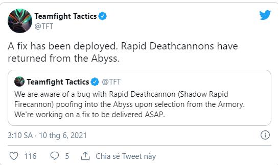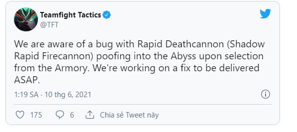 Bên cạnh sự cải tiến đáng kể về Kho Vũ Khí trong ĐTCL mùa 5 phiên bản 11.12, chẳng hạn như giờ đây có thể nhận thêm được những trang bị hoàn chỉnh, trang bị biến hệ và thậm chí là các vật phẩm đặc biệt (Búa Gỡ Trang Bị, Xúc Xắc,…). Thì lượng bug phát sinh “nhờ” những cải tiến này cũng khiến nhiều người dùng phàn nàn đến phát cáu! Đầu tiên là lỗi liên quan đến Kho Vũ Khí, khi người chơi chọn Đại Bác Liên Thanh Hắc Ám nhưng chỉ nhận được phiên bản thường của món trang bị này. Trang chủ DTCL đã chính thức xác nhận lỗi trên và nhanh chóng sửa nó sau vài tiếng.