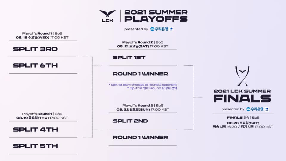 Trong khi đó, vòng 1 và vòng 2 của LCK Mùa Hè vẫn sẽ diễn ra tại LOL Park, thủ đô Seoul. Vòng 1 sẽ diễn ra vào ngày vào các ngày 18 và 19/8. Trong đó, trận đấu đầu tiên giữa đội xếp thứ 3 sau giai đoạn vòng bảng và đội xếp thứ 6 sau giai đoạn vòng bảng sẽ diễn ra vào ngày 18, trận đấu còn lại giữa đội xếp thứ 4 và 5 sẽ diễn ra sau đó một ngày.