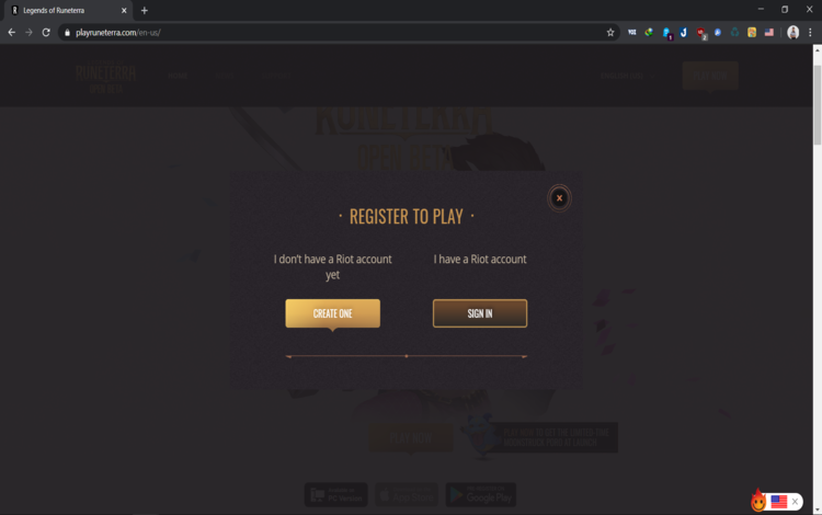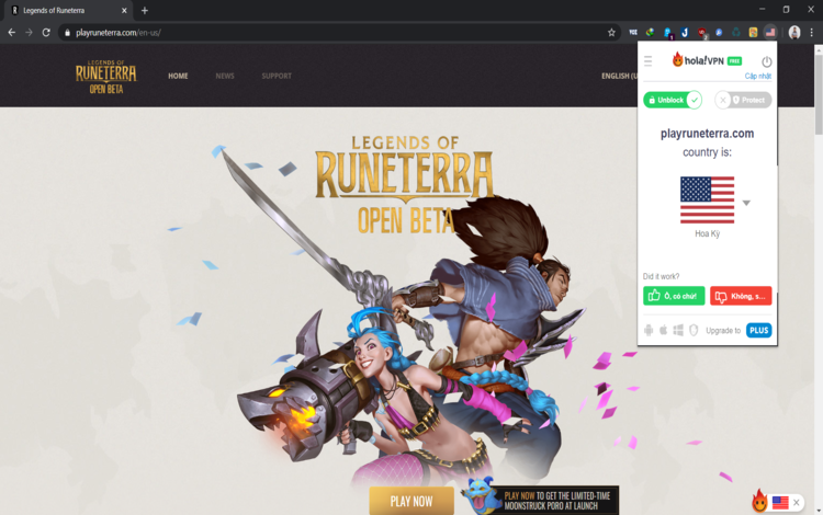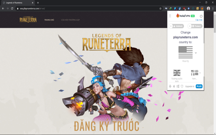 Bước 2: Truy cập trang web https://playruneterra.com/, sau đó chuyển IP từ Việt Nam sang Hoa Kì bằng extension Hola như hình bên dưới.