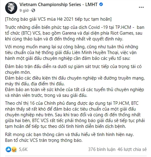 Tuy nhiên, mọi sự chờ đợi của khán giả hâm mộ LMHT Việt Nam dần trở thành nỗi thất vọng, chán nản khi ban tổ chức VCS đã có tới hai lần thông báo hoãn thời hạn khai mạc VCS Mùa hè 2021 do ảnh hưởng của dịch Covid-19. Bất chấp ý tưởng tổ chức thi đấu online giống mùa xuân và mùa hè 2020, những người đứng đầu giải đấu cũng không thể tổ chức vào lúc này bởi dịch bệnh đang diễn biến hết sức phức tạp. Chưa kể đến, những lý do như trận đấu phải diễn ra dưới sự giám sát trực tiếp của trọng tài, đảm bảo đường truyền mạng, máy móc và địa điểm thi đấu, hay phải đảm bảo an toàn sức khỏe cho tất cả tuyển thủ chuyên nghiệp và nhân viên các đội tuyển khiến giải đấu vẫn đang phải tạm hoãn vô thời hạn.