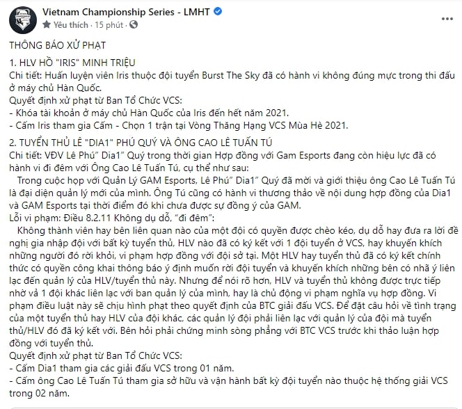 Ngày 17/5, Ban tổ chức VCS đã ra án phạt cực kỳ bất ngờ khi cấm Dia1 thi đấu một năm do anh đã vi phạm vào điều khoản đi đêm.