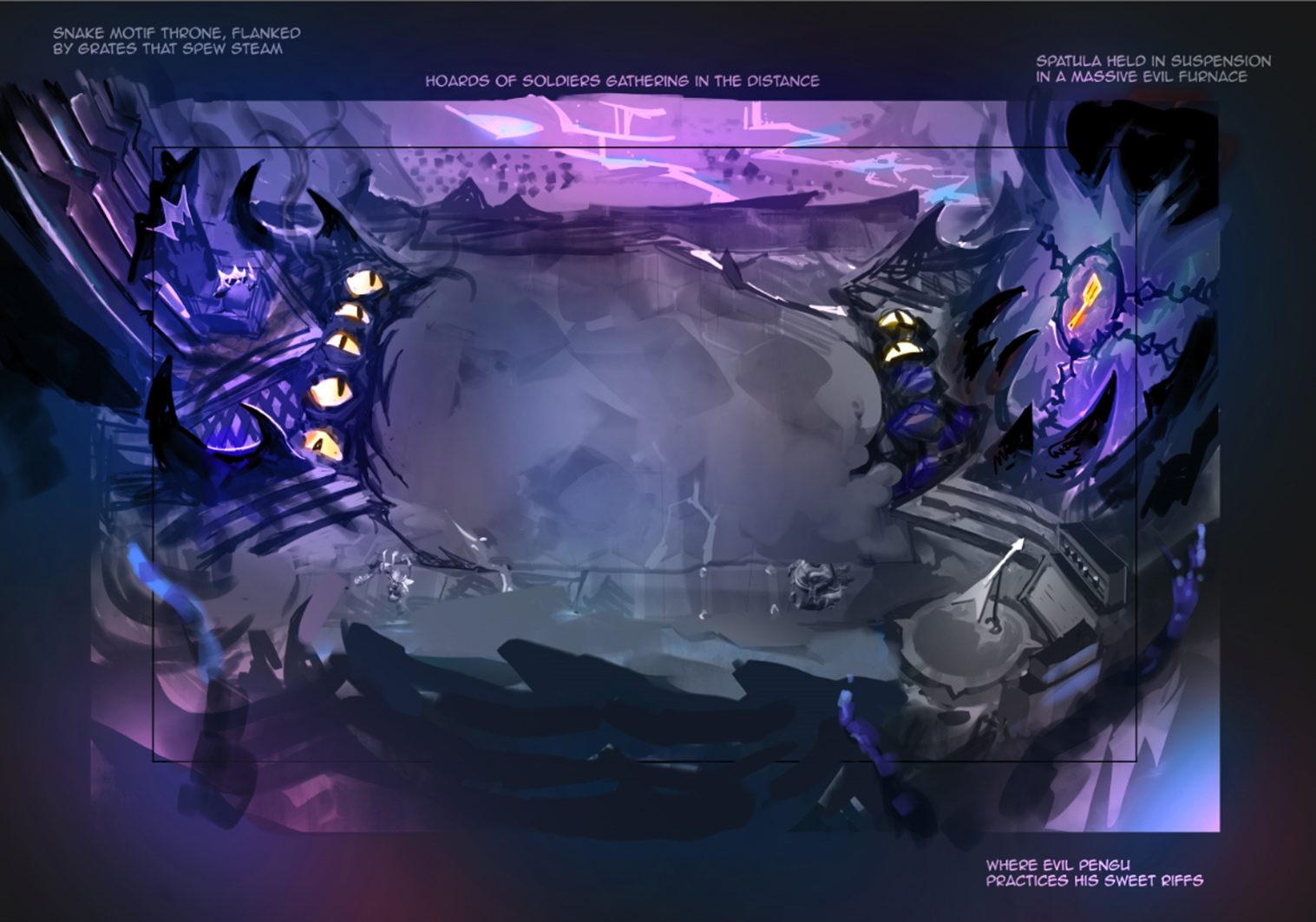 Phải mất một hành trình dài để đến được sào huyệt của Cánh Cụt Suy Vong đấy! Nơi trú ẩn hắc ám nhưng cũng khá ấm cúng này có lẽ là một nơi tuyệt vời để che giấu con tin–ý tôi là, nhìn cái ban nhạc metal kia đi. Đúng vậy, đó là Phiên Tòa Âm Ti! Nhưng trước khi có hàng tá những hiệu ứng hay ho như hiện tại, nó đã khởi đầu từ một bản phác thảo ý tưởng của Họa Sĩ Ý Tưởng Igor Artyomenko dưới đây.