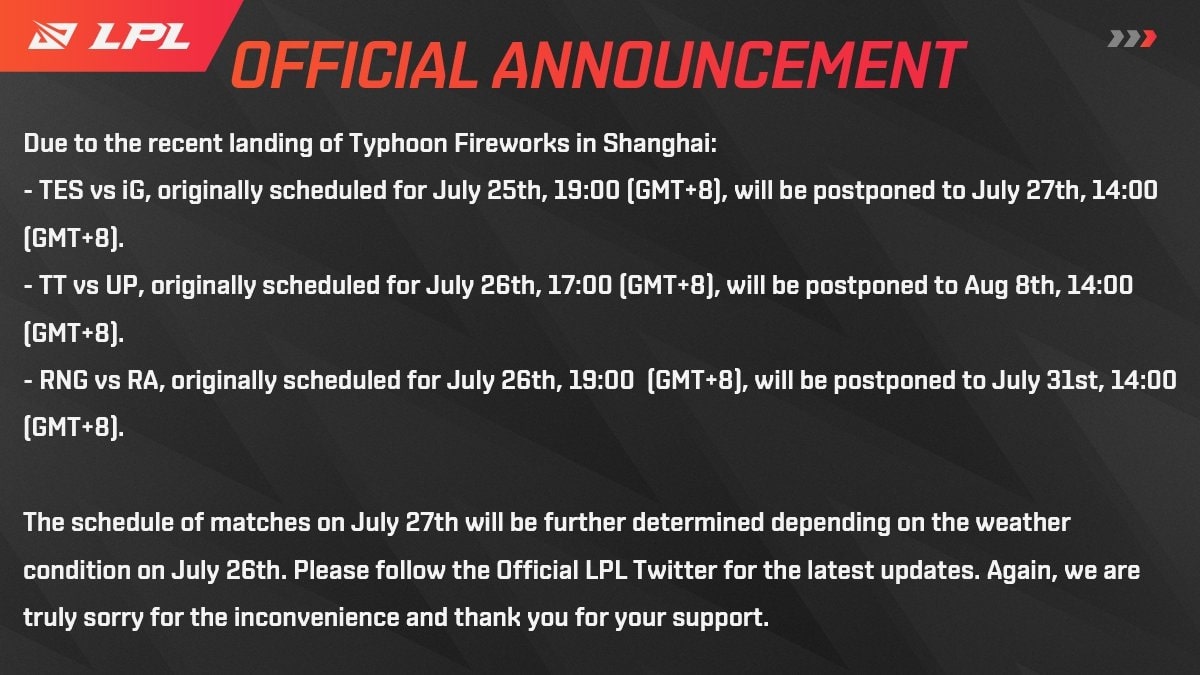 Trận đấu tâm điểm của ngày chủ nhật giữa hai đội tuyển Top Esports và Invictus Gaming đã không thể diễn ra như dự kiến do ảnh hưởng của cơn bão bão Fireworks (In-Fa) đổ bộ vào Thượng Hải. Cơn bão này không chỉ ảnh hưởng tới riêng trận đấu này mà còn tới một số trận đấu khác ở tuần thi đấu tới tổ chức tại thành phố Thượng Hải. Cụ thể: Trận TES vs. IG dời lại lúc 13h ngày 27/07, trận RNG vs. RA (dự kiến diễn ra 18h ngày 26/7) dời lại lúc 13h ngày 31/07, trận TT vs. UP (dự kiến diễn ra 16h ngày 26/7) dời lại lúc 13h ngày 08/08.