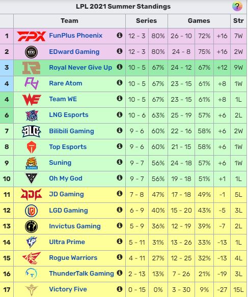 Những cái tên tiêu biểu cho nhóm “ngựa ô” ở mùa giải này có thể kể tới như: Li – Ning Esports, Rare Atom, Bilibili Gaming, hay thậm chí còn là OMG – Thế lực ở những mùa giải đầu tiên của LPL nhưng những mùa gần đây chỉ là kho điểm cho các đối thủ. Những cái tên kể trên đều đã có mùa giải đầy ấn tượng, qua đó có vé tham dự play – off với thành tích hết sức khả quan.