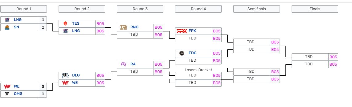 Trước một OMG trẻ trung và tràn đầy khí thế, Team WE đã tận dụng tốt kinh nghiệm và phong độ cao trong mùa giải này để dễ dàng đè bẹp đối thủ sau chưa đầy 90 phút tranh tài của cặp BO5. Thắng lợi này sẽ đưa họ vào vòng tiếp theo gặp một đối thủ cũng giàu sức trẻ khác là Bilibili Gaming.