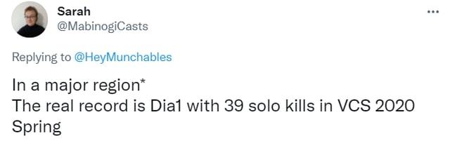 Dù rằng, Knight là một trong số những đường giữa mà bất cứ ai cũng muốn sở hữu trong đội của mình, tuy nhiên, vẫn còn một thách thức nữa đến từ một tuyển thủ đến từ khu vực nhỏ hơn để anh chàng này vượt qua. Người này chẳng phải ai xa lạ với các khán giả LMHT Việt Nam, người đi đường giữa Lê “Dia1” Phú Quý hiện đang thuộc biên chế SBTC Esports. Cụ thể, theo thống kê của nữ BLV trên kênh VCS Unofficial English Mabinogi, Dia1 ở mùa giải Mùa xuân 2020 trong màu áo GAM Esports có tổng cộng 39 tình huống solokill.