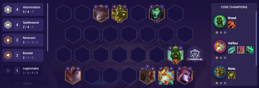 Có vẻ như Thây Ma và Tà Thần đang là hai tộc hệ được ưu ái nhiều nhất trong mùa 5.5 lần này khi có thể sử dụng được trong gần như mọi loại đội hình. Với đội hình Vel’koz Thây Ma, bạn sẽ phải bảo kê “siêu mực” bằng một dàn tanker zombie vững chắc, đồng thời tìm đủ cho mình 4 Ma Pháp Sư để vị tướng này có thể tăng tiến dần sức mạnh.