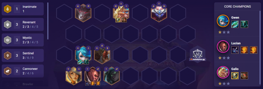 Tiếp tục là một đội hình khác với 3 Bí Ẩn và 3 Tà Thần, nhưng lần này chủ lực sẽ là Lucian. Để buff thêm cho Lucian, bạn sẽ phải thêm vào 2 tướng Galio và Senna để kích hoạt 3 Vệ Binh và 2 Pháo Thủ.