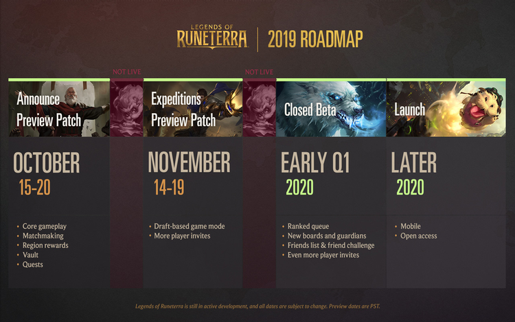 Hai bản preview trước đó vào tháng Mười và tháng Mười Hai năm ngoái đã cho người chơi một vài thông tin sơ lược về trò chơi thẻ bài LoR. Và cùng với việc công bố mở Open Beta, Riot Games cũng đã công bố các mốc thời gian chi tiết của LoR.