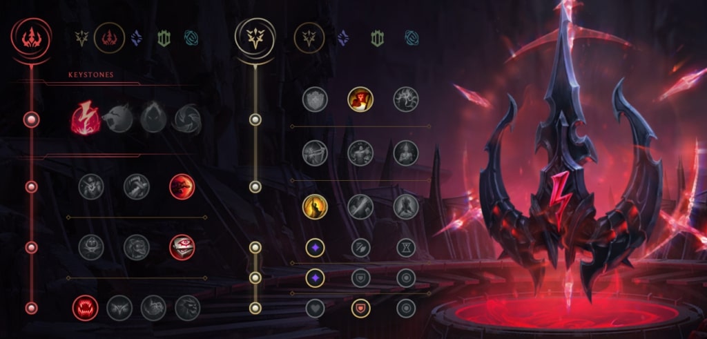 Hai điểm ngọc tái tổ hợp được ưu tiên sử dụng đối với Katarina sẽ là Áp Đảo ở nhánh chính và Chuẩn Xác ở nhánh phụ. Ở nhánh chính Áp Đảo, khả năng gây sát thương sốc sẽ được đảm bảo với điểm chính Sốc Điện kết hợp với Tác Động Bất Chợp, Thu Thập Nhãn Cầu và Thợ Săn Tham Lam. Ở nhánh phụ, hai điểm ngọc nên ưu tiên là Đắc Thắng để giúp bạn có khả năng hồi máu sau khi có điểm hạ gục hoặc hỗ trợ, cùng với đó, Nhát Chém Ân Huệ giúp Katarina nhanh chóng kết liễu đối thủ ngay lập tức khi đối thủ có lượng máu thấp.