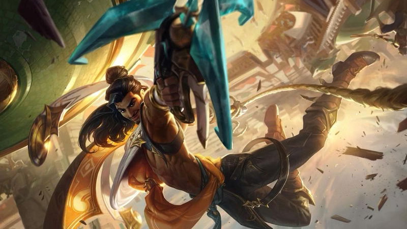 – Kỹ năng: Đòn đánh của Akshan sẽ giảm 50% giáp của mục tiêu trong 5 giây. Khi kích hoạt, Akshan bắn ra một dây móc, lao về phía kẻ thù xa nhất và được tăng 75% / 100% / 400% tốc độ đánh trong 4 giây. Khi đu dây, Akshan vẫn sẽ tấn công mục tiêu gần nhất với tốc độ đánh được nhân đôi.