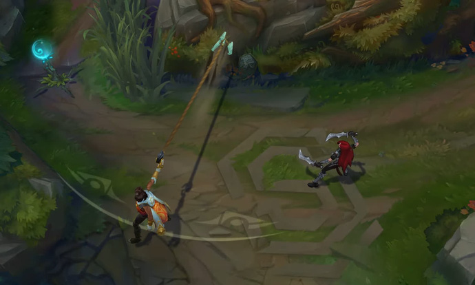 Một điểm khác biệt nữa đến từ bộ kỹ năng của vị tướng này chính là cơ chế tạo lá chắn, ngụy trang và đu dây nên khả năng giữ an toàn là mạnh hơn hẳn, bởi hắn có quá nhiều công cụ để câu kéo trong giao tranh và trao đổi chiêu thức.