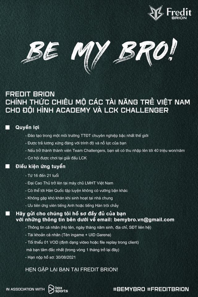 Hy vọng, sẽ có những bạn trẻ đủ điều kiện hồ sơ để gia nhập Fredit BRION, không những thế, biết đâu qua quá trình luyện tập, người hâm mộ LMHT Việt Nam sẽ được chứng kiến một tuyển thủ LMHT chuyên nghiệp được tham gia thi đấu tại LCK Challengers rồi được đưa lên đội hình một đánh LCK.