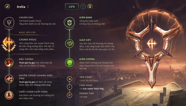 Về cách xây dựng Irelia sau khi làm lại thì Chinh Phục ở nhánh Chuẩn Xác vẫn là ngọc siêu cấp phù hợp nhất với vị tướng này. Ở nhánh phụ thì bạn có thể lựa chọn các điểm ở bảng Cảm Hứng như Giao Hàng Bánh Quy, Thuốc Thời Gian để gia tăng tối đa khả năng trụ đường cho Irelia. Bạn cũng có thể sử dụng nhánh Kiên Định với các điểm như Giáp Cốt, Kiên Cường để đảm bảo sự cứng cáp và gia tăng chỉ số kháng hiệu ứng.
