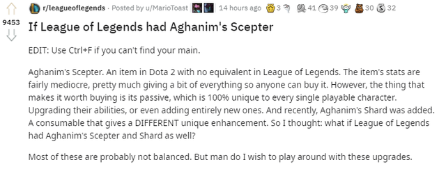 Sự đặc biệt của Aghanim’s Scepter, Aghanim’s Shard đã khiến DOTA 2 trở nên cực kỳ thú vị và thu hút sự chú ý của cả những người chơi LMHT. Một vài người đã đặt ra câu hỏi rằng: “Sẽ ra sao nếu tướng LMHT cũng được nâng cấp kỹ năng bằng Aghanim’s Scepter và Aghanim’s Shard?”. Và mới đây thì một người dùng Reddit có tên là u/MarioToast đã có bài viết vô cùng tâm huyết để trả lời cho câu hỏi này.