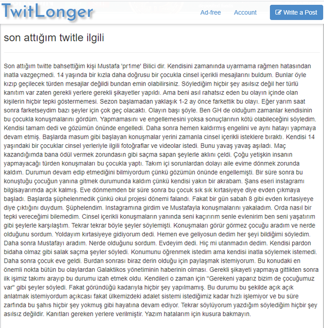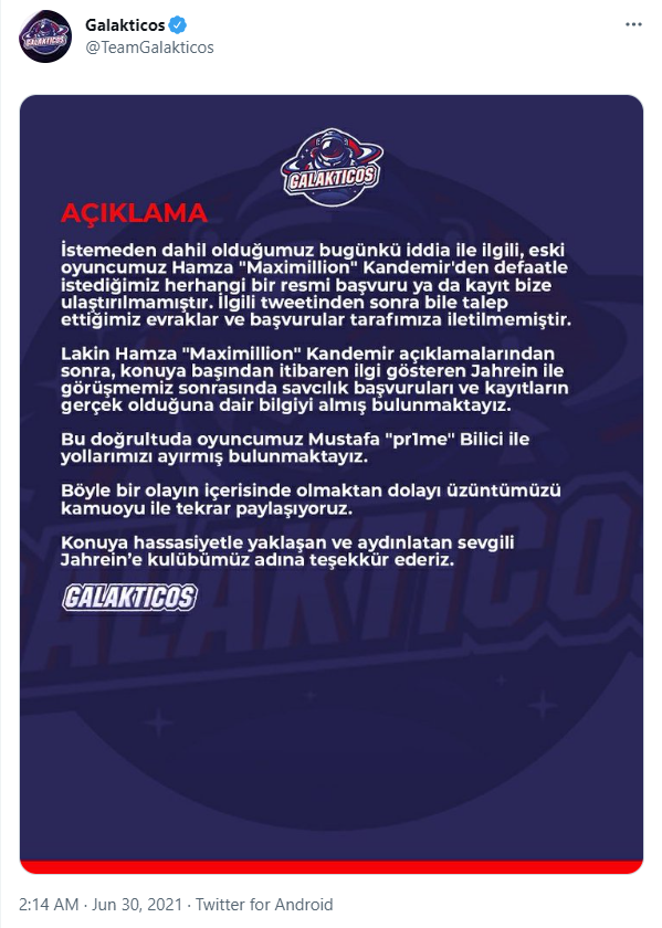 Vào rạng sáng ngày 30/6 (theo giờ Việt Nam), làng LMHT Thổ Nhĩ Kỳ đã trải qua một cú sốc thật sự khi một tuyển thủ chuyên nghiệp bị bóc phốt bởi đồng đội cũ. Cụ thể thì cựu tuyển thủ Đường giữa của team Galakticos – Hamza “Maximillion” Kandemir đã chia sẻ rằng người chơi Đường trên – Mustafa “Pr1me” Bilici đã có nhiều tin nhắn quấy rối một cô bé mới 14 tuổi.