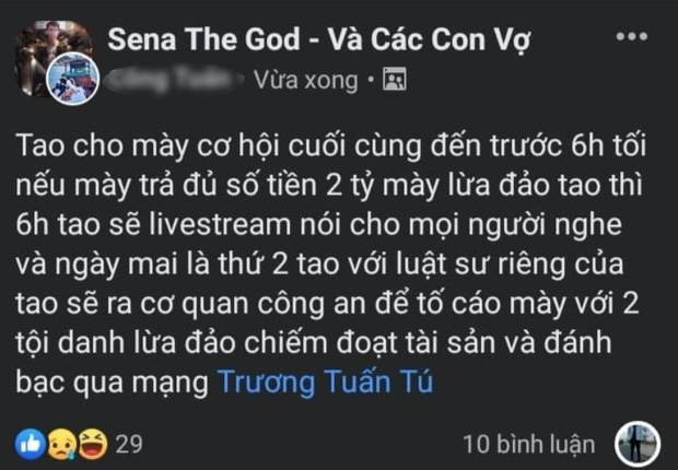 Cụ thể, anh C.T, một admin trong group Sena và đã từng cưu mang giúp đỡ anh chàng khi rơi vào hoàn cảnh bi đát đã trực tiếp tố cáo rằng streamer Hải Phòng đã lừa mất của anh số tiền lên tới 2 tỷ đồng để “nướng” toàn bộ vào cá độ bóng đá. Đồng thời, anh này cho biết thêm nếu Sena không thanh toán toàn bộ số tiền nợ này trước 6h tối ngày 11/7, ngay ngày thứ 2 (12/7), anh C.T sẽ tố cáo toàn bộ sự việc lên công an.