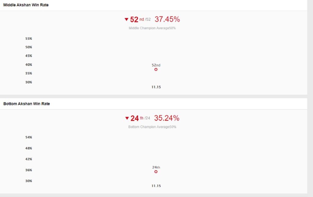 Akshan là vị tướng được coi là tệ nhất trong kỷ nguyên mùa 11 trong Liên Minh Huyền Thoại khi sở hữu tỷ lệ thắng thấp kỷ lục.