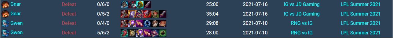 Tuy nhiên, sự trở lại của anh chẳng giúp cho IG cải thiện một chút nào về mặt phong độ. Đội tuyển này để thua đầy bạc nhược trước cả RNG và JDG và chỉ có được thắng lợi trước Victory 5 – “kho điểm” của LPL Mùa hè 2021. Điều này khiến nhà vô địch Mùa xuân 2019 mới chỉ có được 4 thắng lợi sau 11 trận đã đấu và bắt buộc IG phải thắng tất cả các trận còn lại mới mong có hy vọng góp mặt tại vòng play – off.