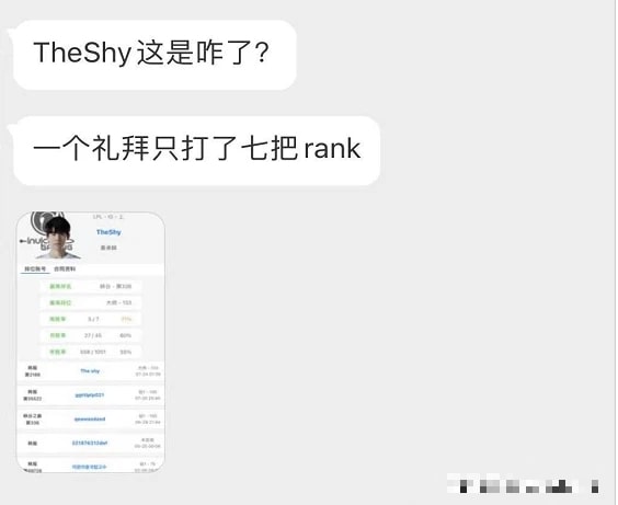Thậm chí, sự chỉ trích của người hâm mộ Invictus Gaming đối với siêu sao đường trên của mình ngày càng lớn hơn khi họ phát hiện ra rằng TheShy chỉ thi đấu đúng 7 trận đấu xếp hạng đơn trong 1 tuần vừa qua, tức trung bình một ngày anh chỉ thi đấu một trận xếp hạng đơn.