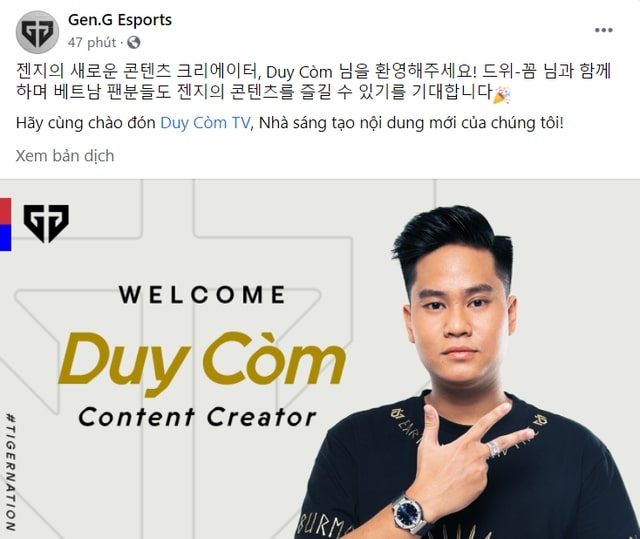 Vào đầu giờ chiều nay, tổ chức Gen.G Esports với nội dung như sau:“Chào mừng đến với Gen.G, Người sáng tạo nội dung mới của chúng tôi – Duy Còm. Chúng tôi rất mong được chào đón những sản phẩm mới của bạn dưới mái nhà Gen.G.”