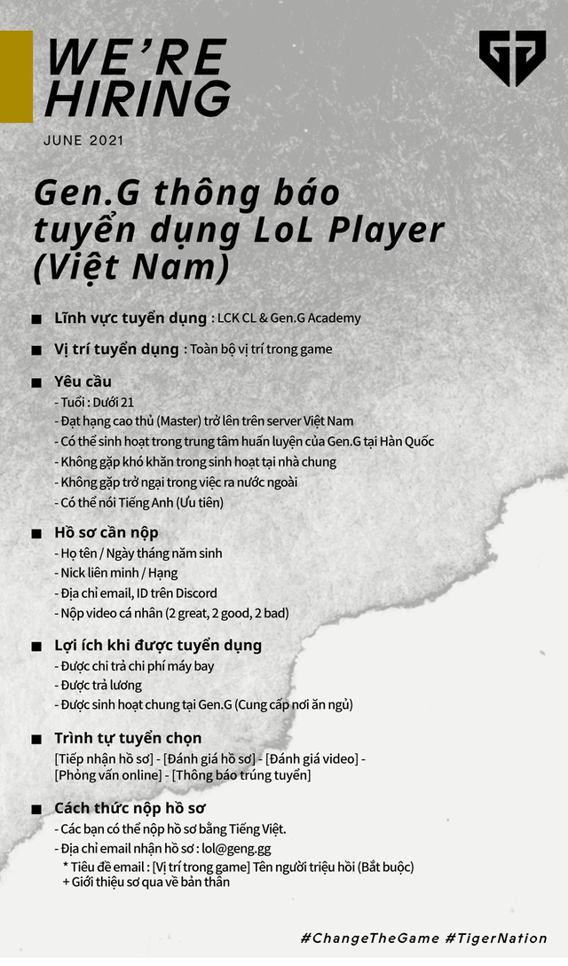 Cách đây không lâu, cũng chính Gen.G Esports là tổ chức mở đầu cho quá trình hợp tác này khi công bố chương trình tìm kiếm, tuyển dụng những ngôi sao LMHT trẻ tiềm năng của Việt Nam. Biết đâu đấy, những tuyển thủ Việt Nam may mắn lọt vào “mắt xanh” của các nhà tuyển trạch có thể thể hiện tài năng của mình và giúp LMHT được nở mày nở mặt hơn nữa với các fan hâm mộ trên khắp thế giới.