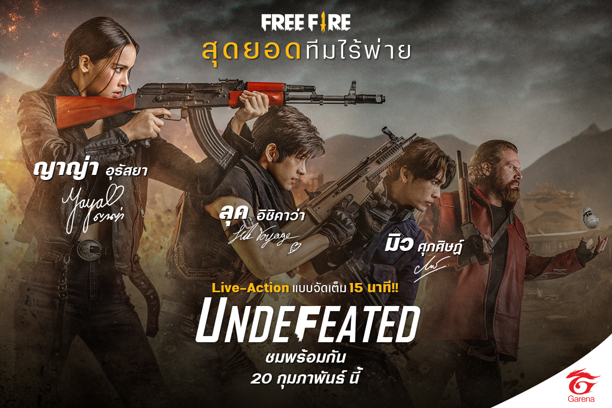 Undefeated cũng có rất nhiều tài liệu giúp bạn tham khảo về Free Fire, chẳng hạn như một nhân vật sử dụng ván lướt sóng trước khi mở dù, khu vực an toàn thu nhỏ lại mỗi lần, và cũng có một thùng chiến lợi phẩm chứa vũ khí bom keo. Bộ phim live action này được thực hiện bởi Garena Free Fire Thái Lan và cũng được thủ vai bởi nhiều diễn viên Thái Lan